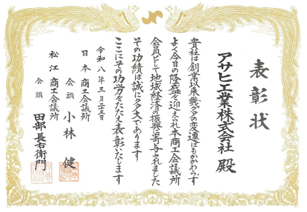 令和8年3月23日(月)、ホテル一畑にて松江商工会議所 永年会員企業表彰式が行われ、松江商工会議所入会から20年以上かつ創業30年以上の企業に贈られる、永年会員企業表彰を受けました。