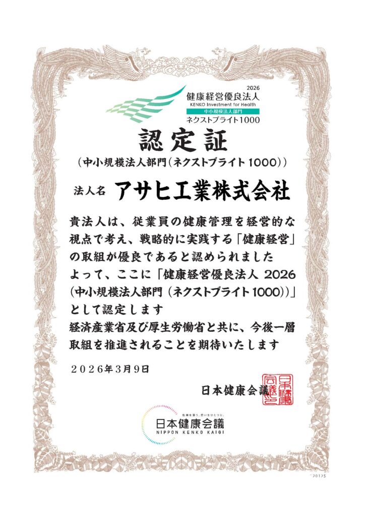 弊社はこれまで、「健康経営優良法人(中小規模法人部門)」の認定を受けてきましたが、この度、中小規模法人部門の上位501~1500位までの法人が認定される「ネクストブライト1000」に認定されました。